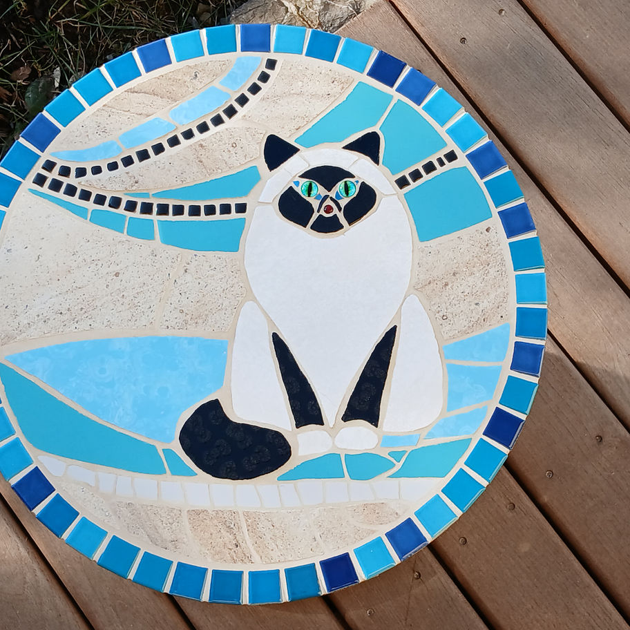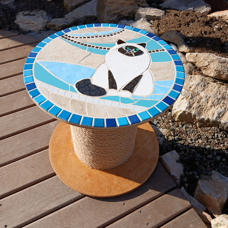 První stolek nemohl mít jiný než kočičí motiv. Při jeho výrobě jsem použila obkladačky, mozaikové kameny a korálky. Základ stolečku tvoří špulka, jejíž dřevěné části jsou ošetřeny nátěry značky REMMERS, nožka je omotána jutovým lanem a spodek (stojná část stolku) je podlepen kobercem, aby nedošlo k pokrábání podlahy. Stolek je primárně určený do interiéru (aby nedocházelo k přílišnému navlhání jutového lana), snese ale i zastřešené terasy.